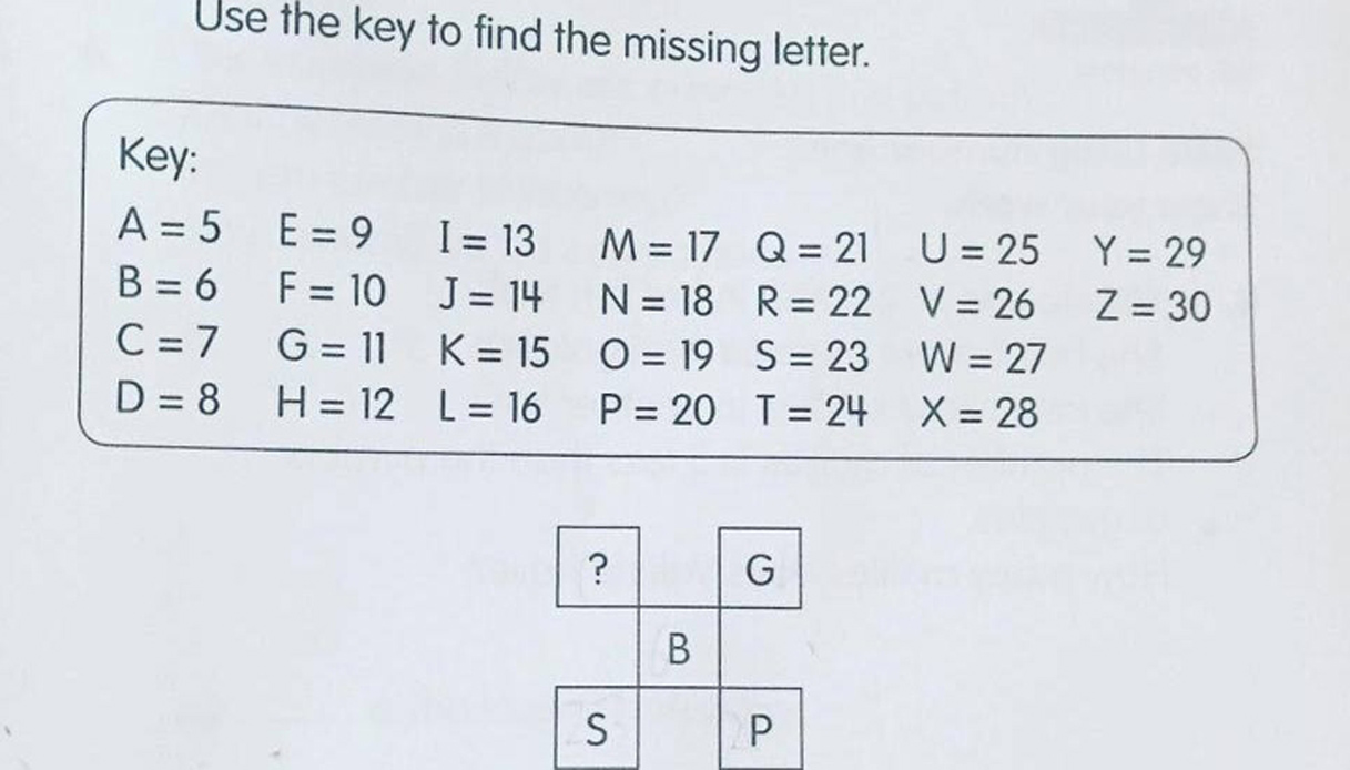 Quale lettera va dunque inserita al posto del punto di domanda? Molti hanno azzardato che si tratterebbe della lettera J, corrispondente al numero 14. Infatti 14 (J) meno 11 (G) dà, lo stesso risultato ottenuto sottraendo 20 (P) a 23 (S). Inoltre, sia 20 (P) meno 11 (G), sia 23 (S) meno 14 (J) danno 9 come risultato. Infine, il numero 40 e` la somma dei fattori in ordine diagonale: 14 (J) + 6 (B) + 20 (P) ma anche 11 (G) + 6 (B) + 23 (S).
