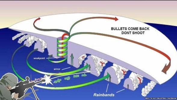 La singolare idea di Ryon, comunque, è rimbalzata sui giornali: ne scrive la Bbc, raccontando che «si è inventato quell’appuntamento su Facebook un po’ per noia un po’ per vincere lo stress», e che la risposta degli utenti lo ha sorpreso, «è andata un po’ oltre le mia capacità di gestire l’evento». Sui social network la singolare iniziativa si è diffusa come un virus «Tiriamo giù quel bastardo» si incitavano, neanche fosse un semplice e sfortunato uccello , portando una ventata di follia in mezzo ai venti a 300 chilometri orari di Irma. Alcuni hanno perfino postato un diagramma che spiega come sparare dentro l’uragano, sottolinea The Independent: perché il rischio, nemmeno tanto remoto, è che il movimento a vortice trasporti i proiettili e li riporti indietro, se non a chi li ha sparati, a persone inermi e incolpevoli. Non bastassero travi di abitazioni, alberi, interi ponti, auto e camion scagliati nel cielo dalla forza del tifone. Effetti collaterali , li chiamano. Non contenti, ci sono abitanti della Florida che propongono di bersagliare l’uragano con lanciafiamme.